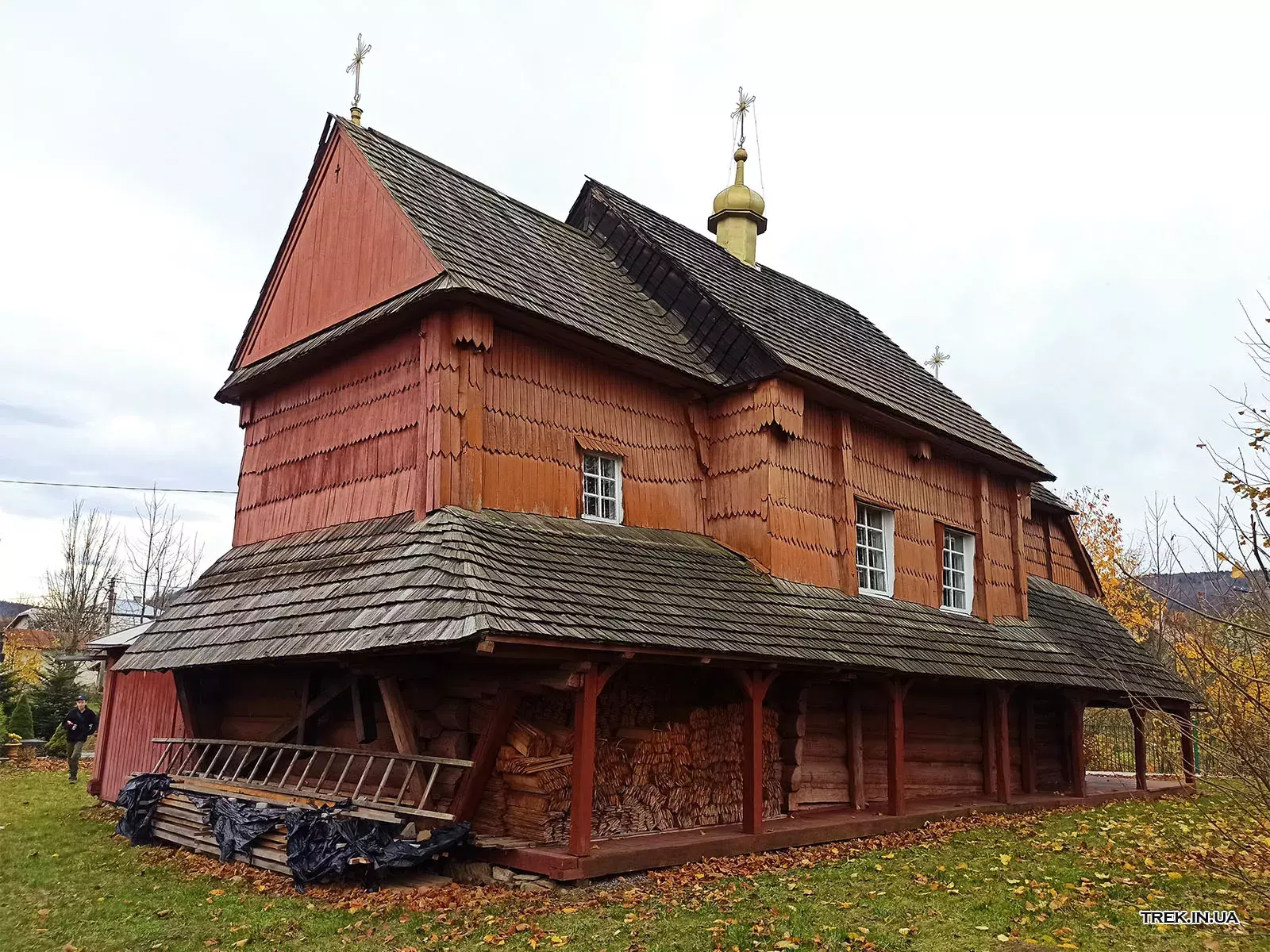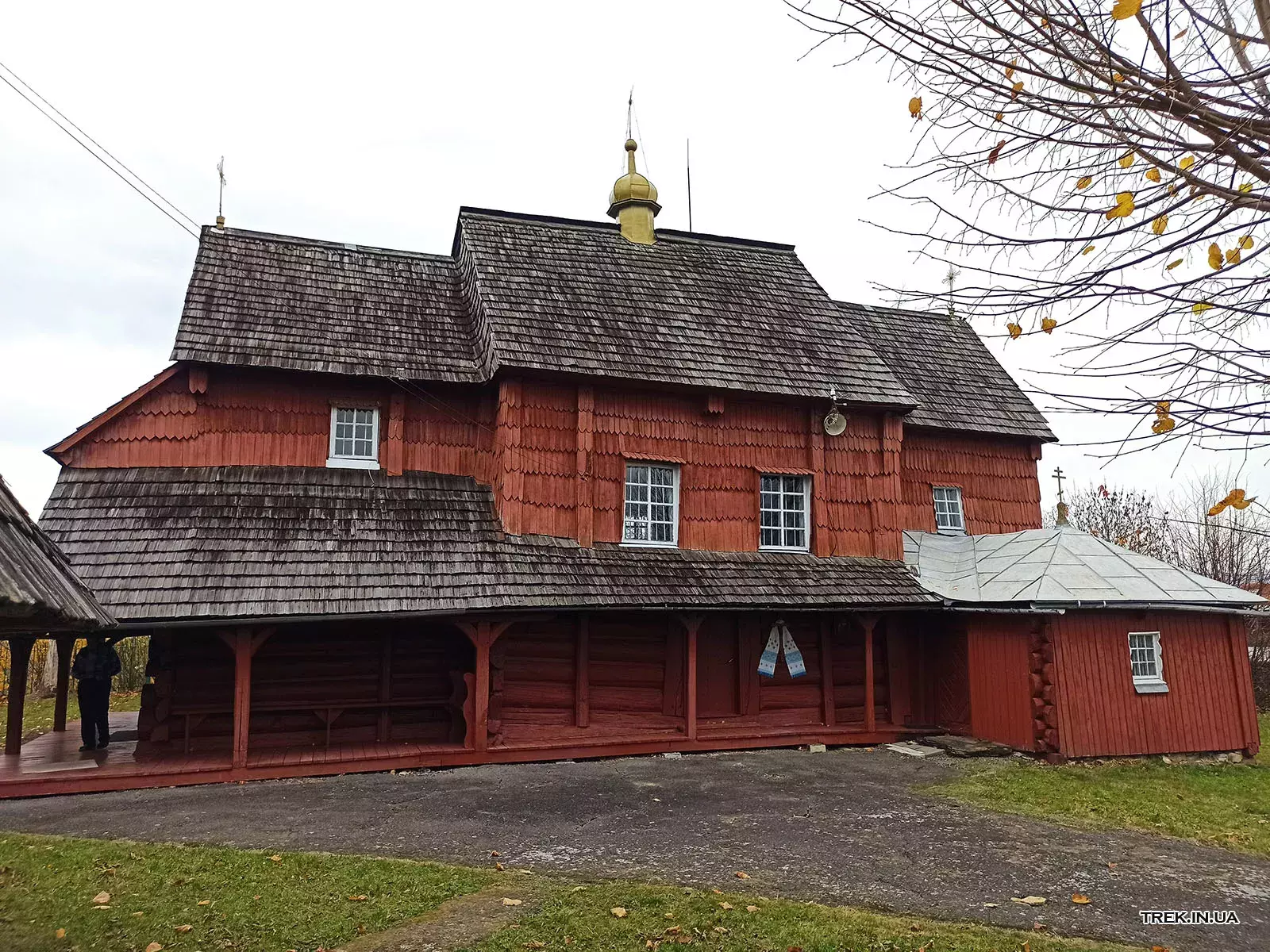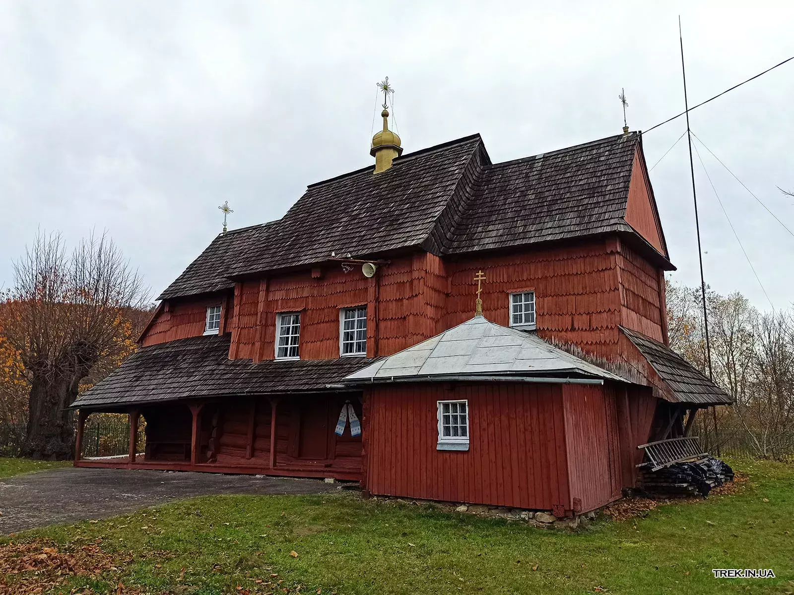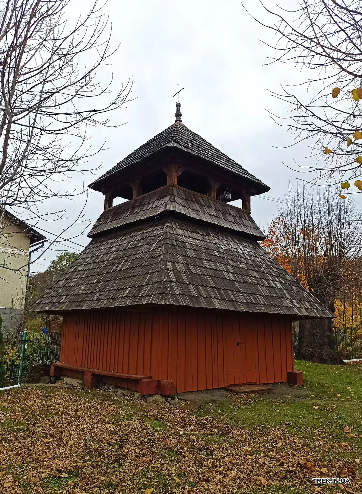 Поруч із храмом стоїть дерев’яна дзвіниця, зведена у тому ж архітектурному стилі. Вона гармонійно доповнює ансамбль церкви, має двоярусну конструкцію з наметовим верхом