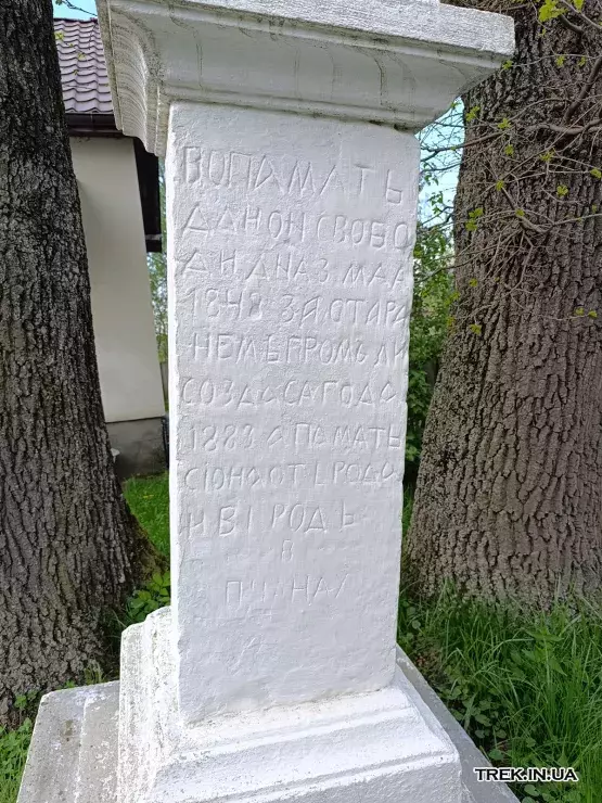 На пам'ять даної свободи, дня 3 травня 1848 року. За старанням громади створено (цей пам’ятник) у 1883 році. І хай пам’ять буде збережена від роду до роду в селі Пчани.