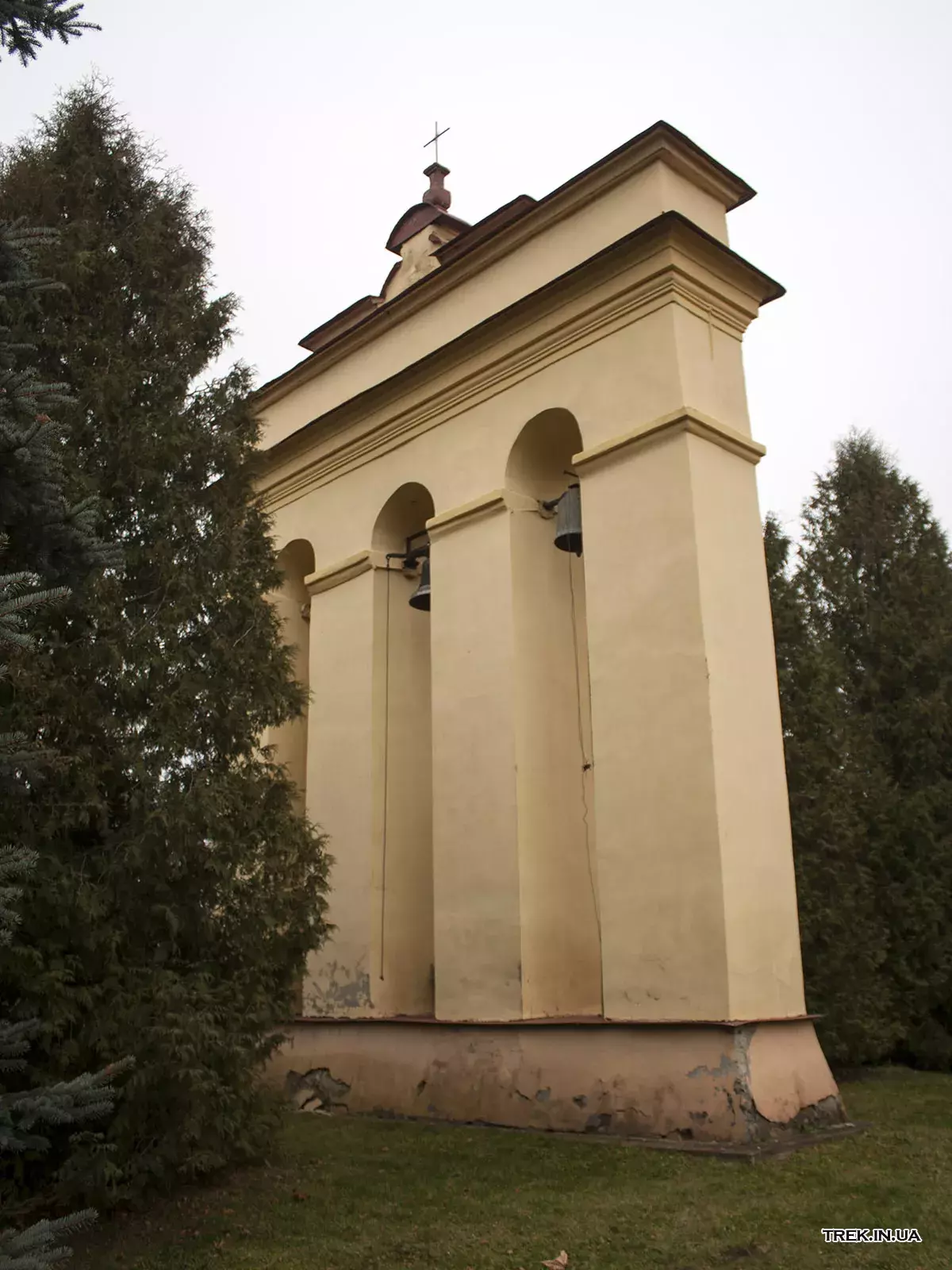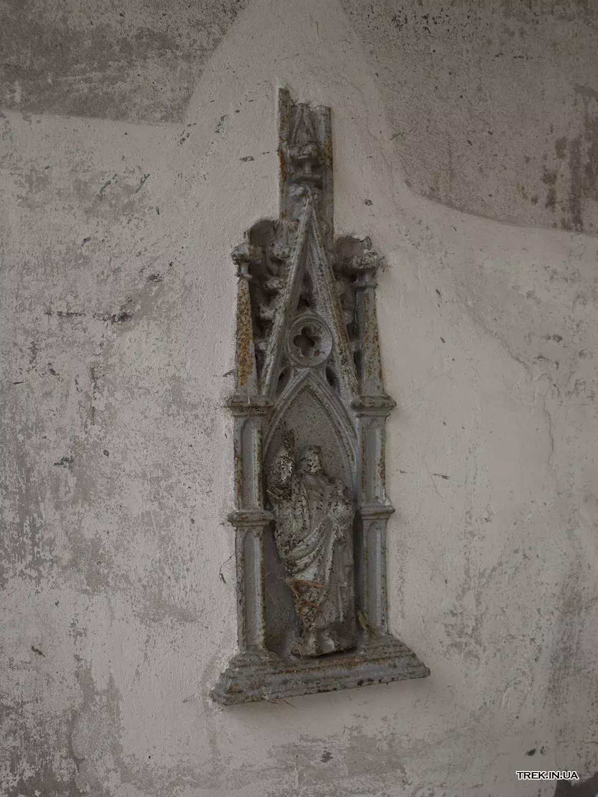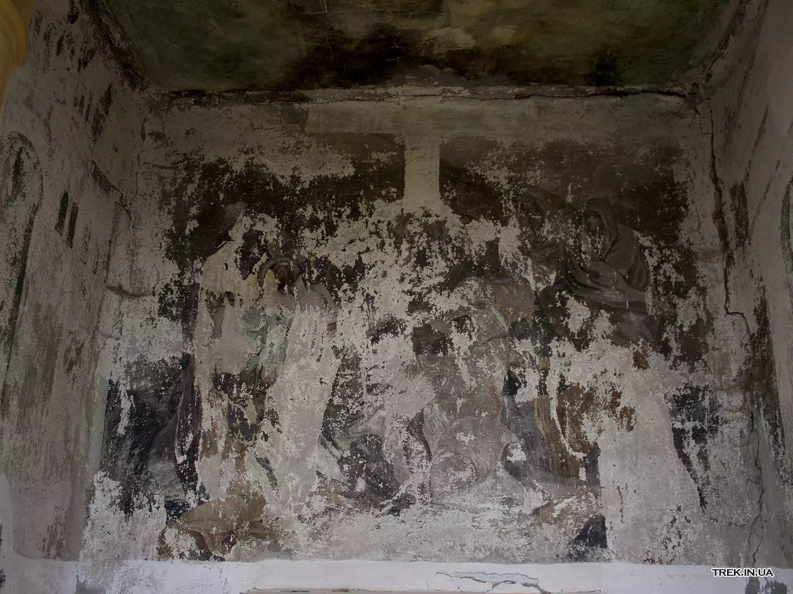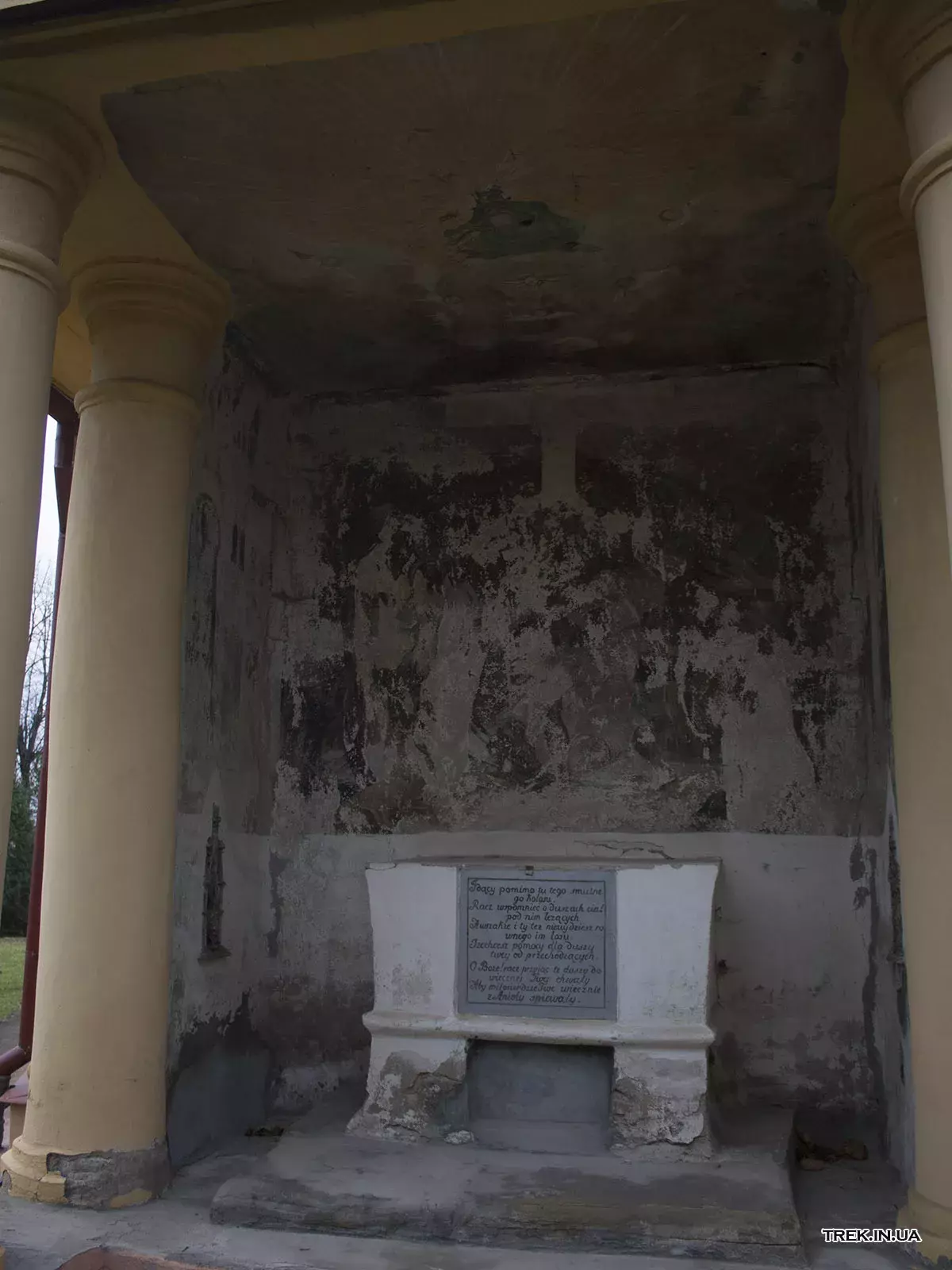 Цікавою деталлю є розташована біля апсиди невелика меморіальна споруда з двома колонами та фрагментами стінопису. Усередині вмонтована епітафія польською мовою: