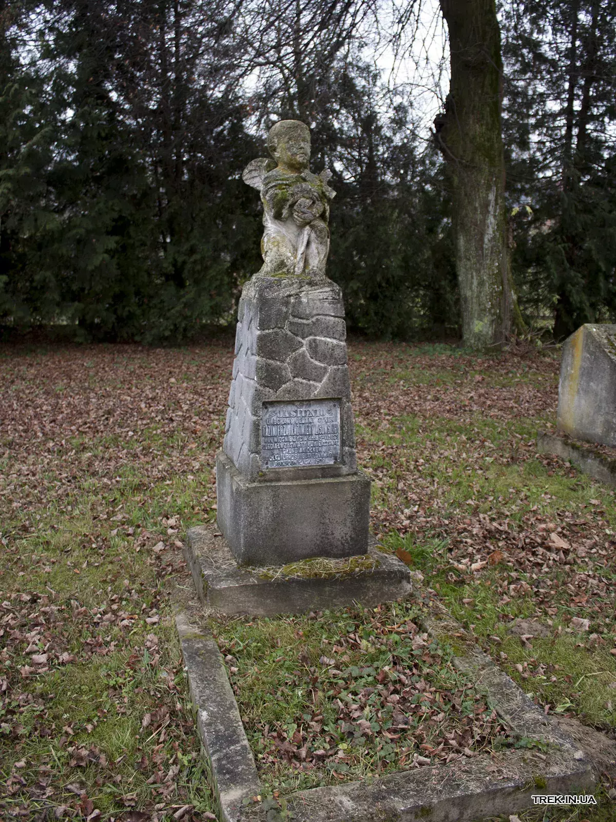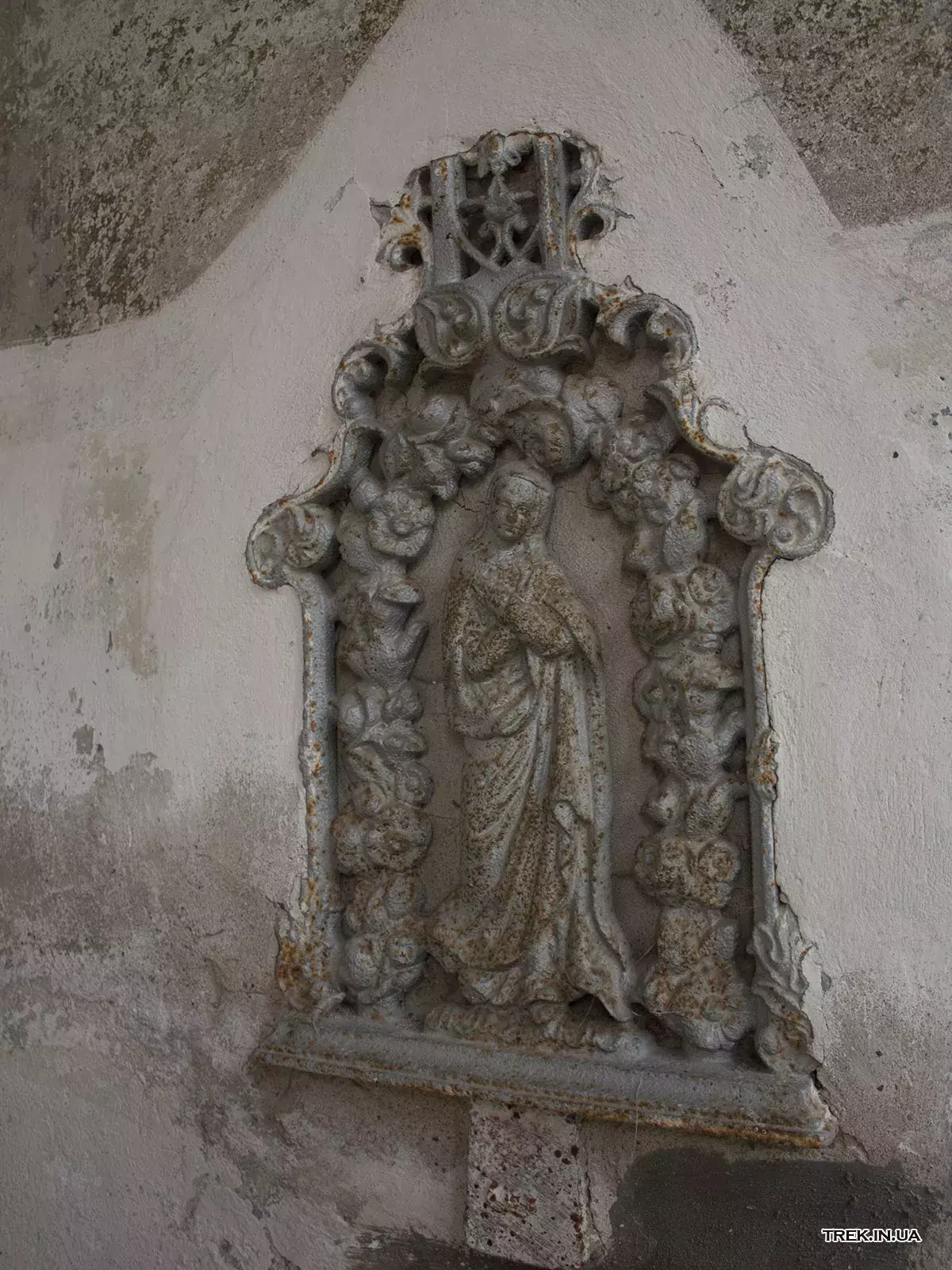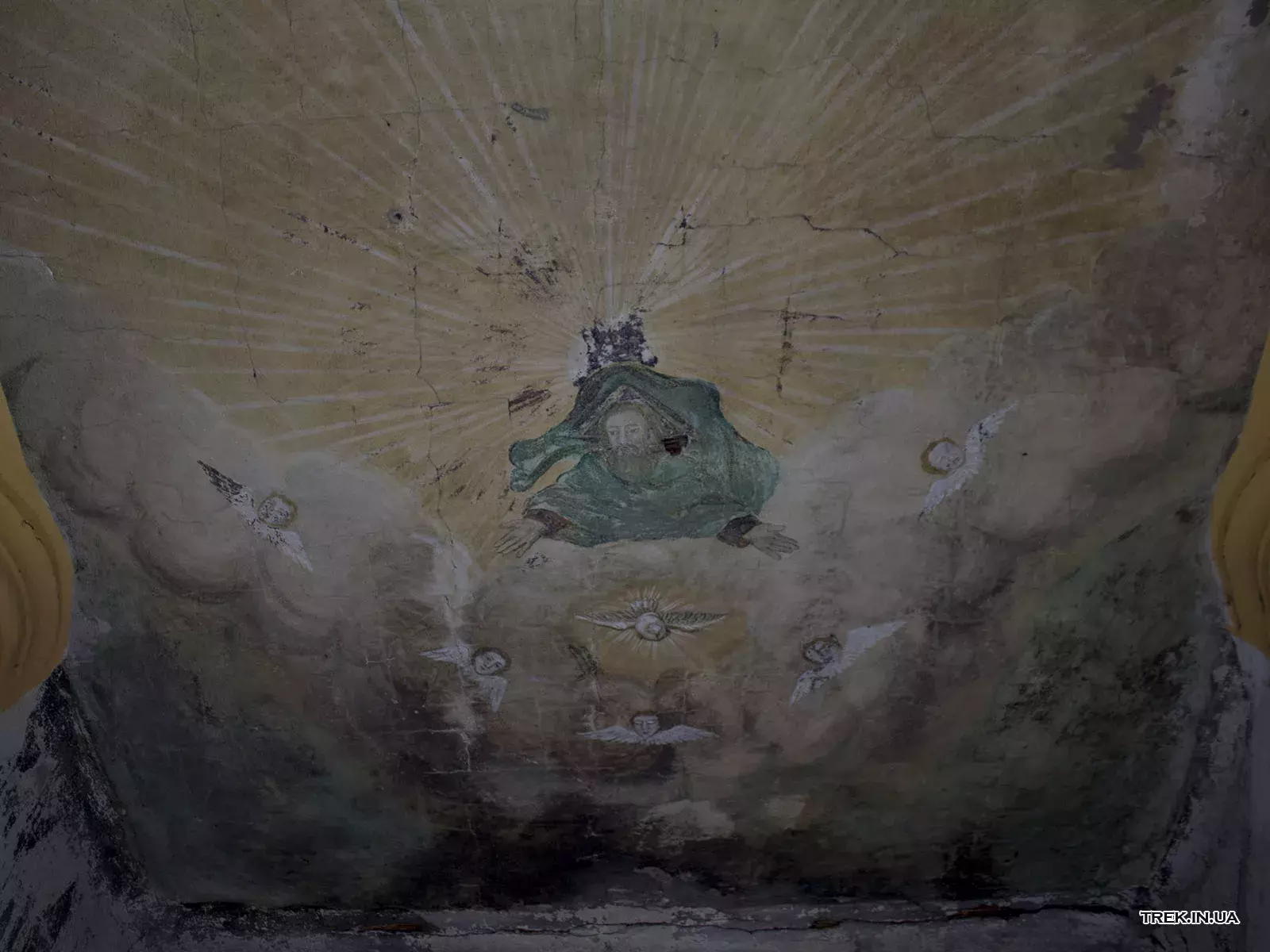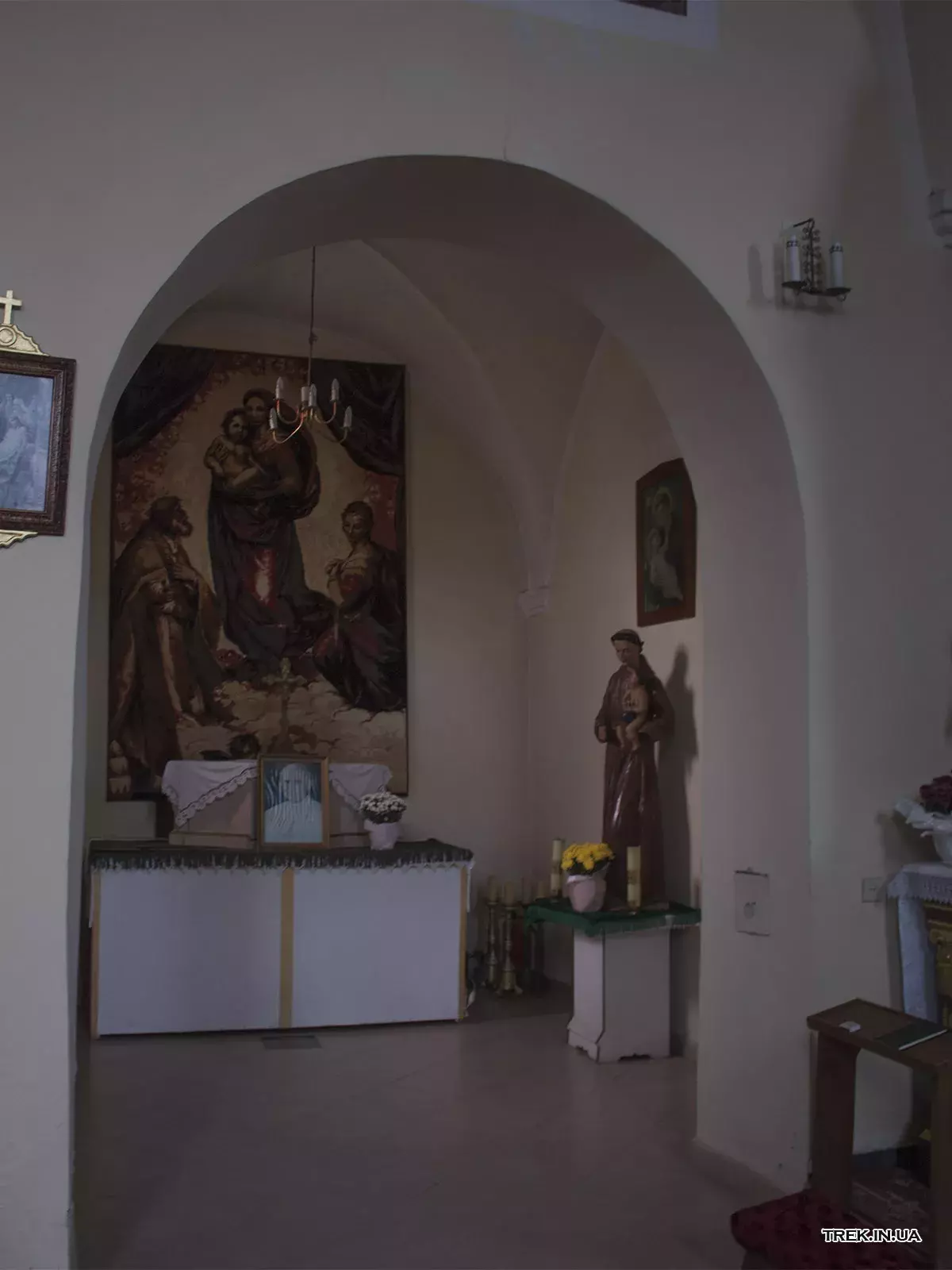Цікавою деталлю є розташована біля апсиди невелика меморіальна споруда з двома колонами та фрагментами стінопису. Усередині вмонтована епітафія польською мовою: