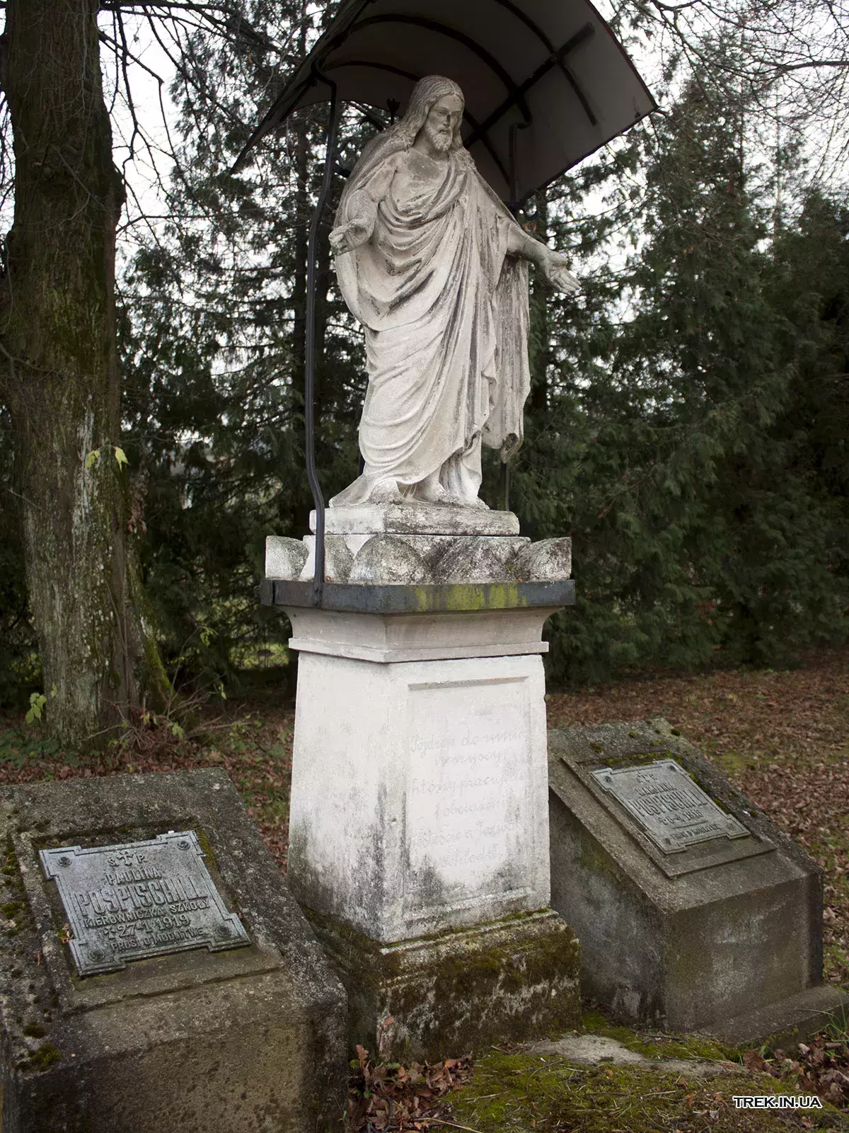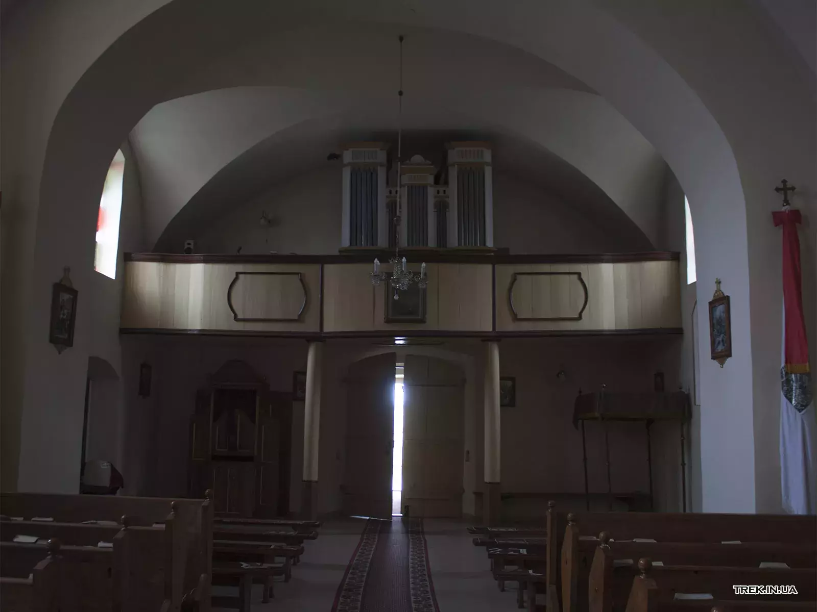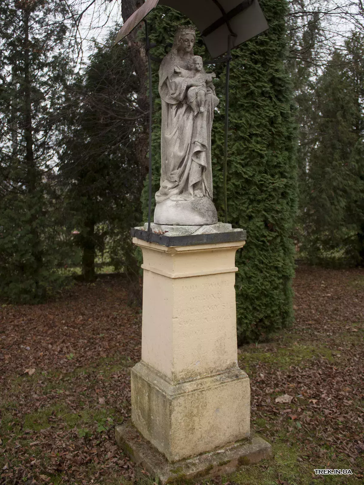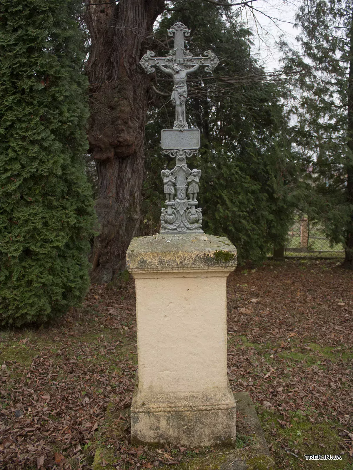 Цікавою деталлю є розташована біля апсиди невелика меморіальна споруда з двома колонами та фрагментами стінопису. Усередині вмонтована епітафія польською мовою: