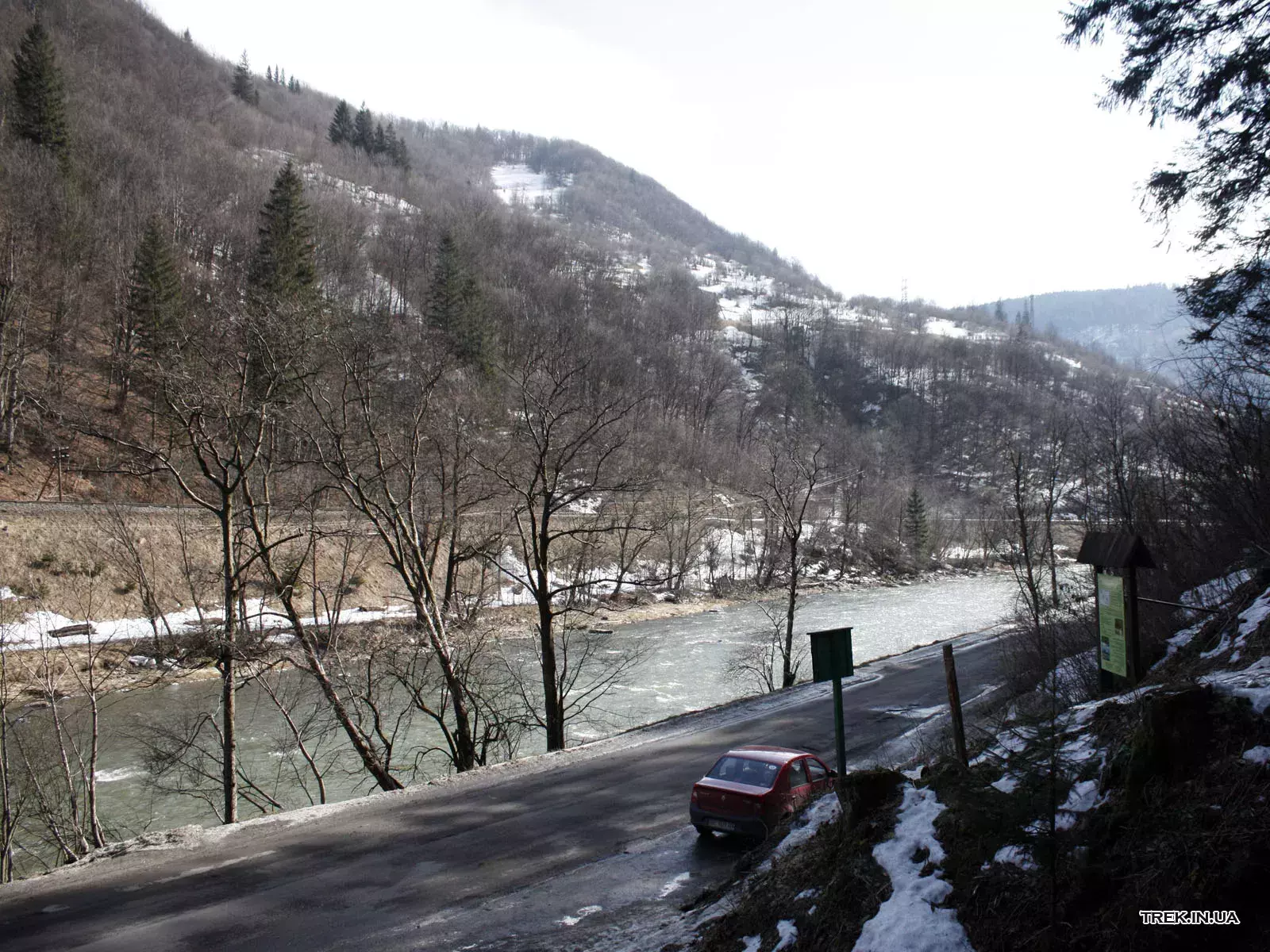 Під час нашої подорожі до Ясіня, де ми планували відвідати старовинну дерев’яну Струківську церкву, ми випадково натрапили на водоспад Труфанець. Його неможливо не помітити — він розташований просто біля автодороги Н-09, між селами Ясіня та Кваси, і вражає своєю красою навіть узимку.